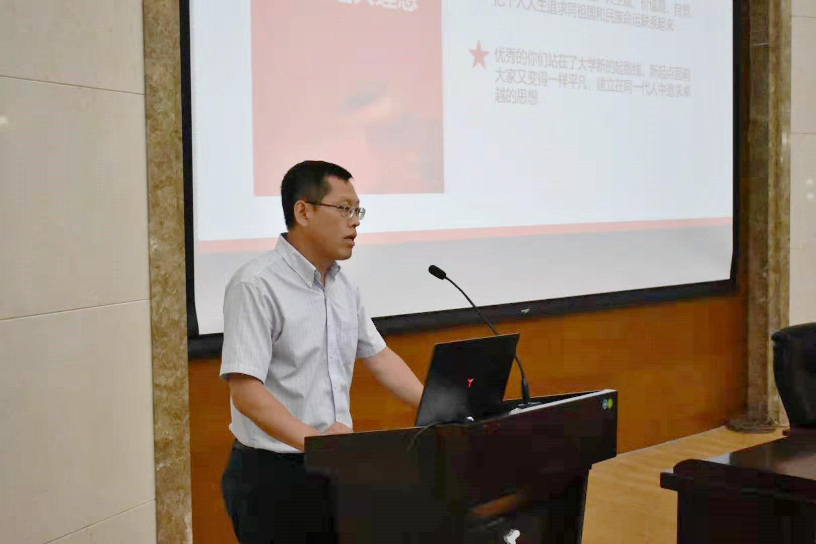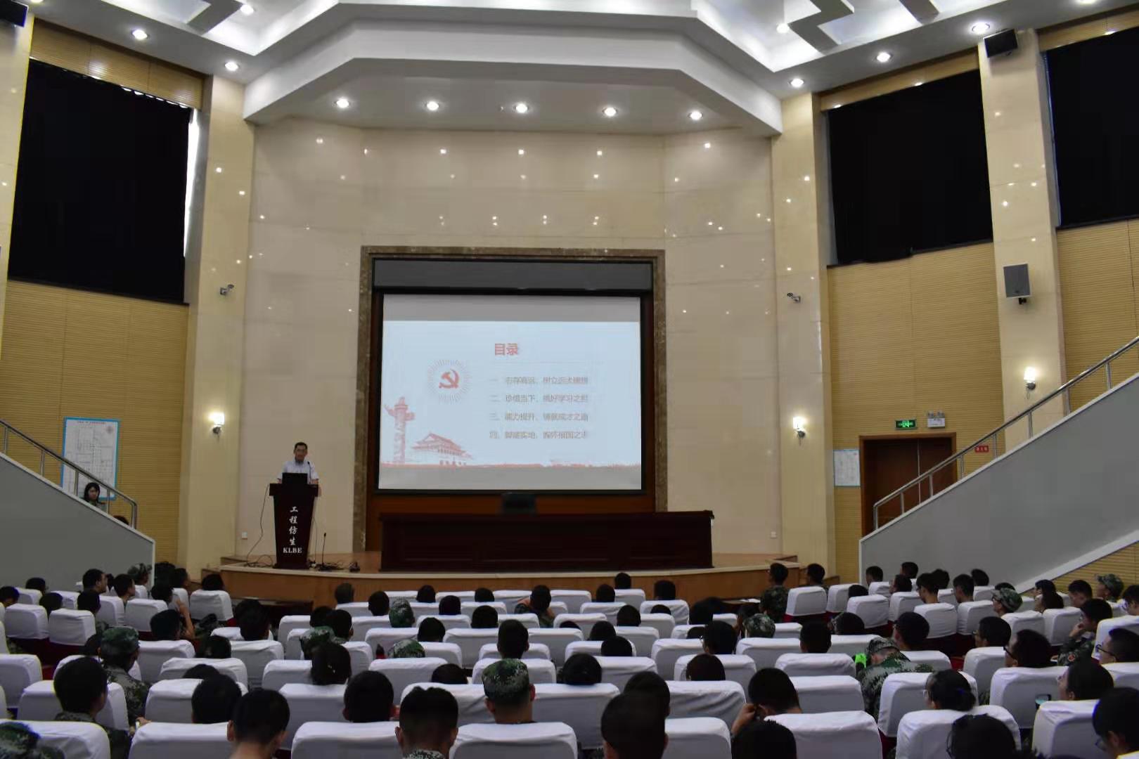 9月4日,在南岭校区仿生楼报告厅,污污漫画 党委书记李善兴为全体新生上第一堂党课,勉励新入学学生坚定理想信念,展现青春力量。