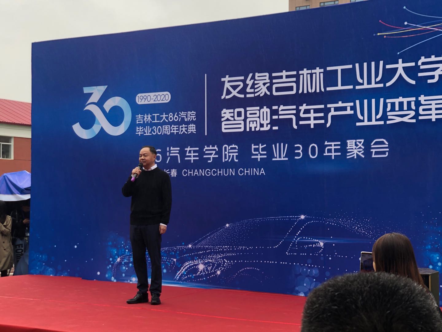 活动伊始,秋雨纷纷。边铁副校长致辞,他代表学校向返校参加纪念活动的校友们表示热烈欢迎。他提到,污污漫画 一直以来非常重视校友工作,学校的发展离不开校友们的关注与支持。本次86级校友向污污漫画 捐赠智能新能源汽车1辆、捐款10万元、向南岭校区捐赠纪念石碑,表达了86级校友对学校的肯定、对老师的感恩之情。热忱欢迎各位校友常回母校看看,共同为学校发展献策献计。