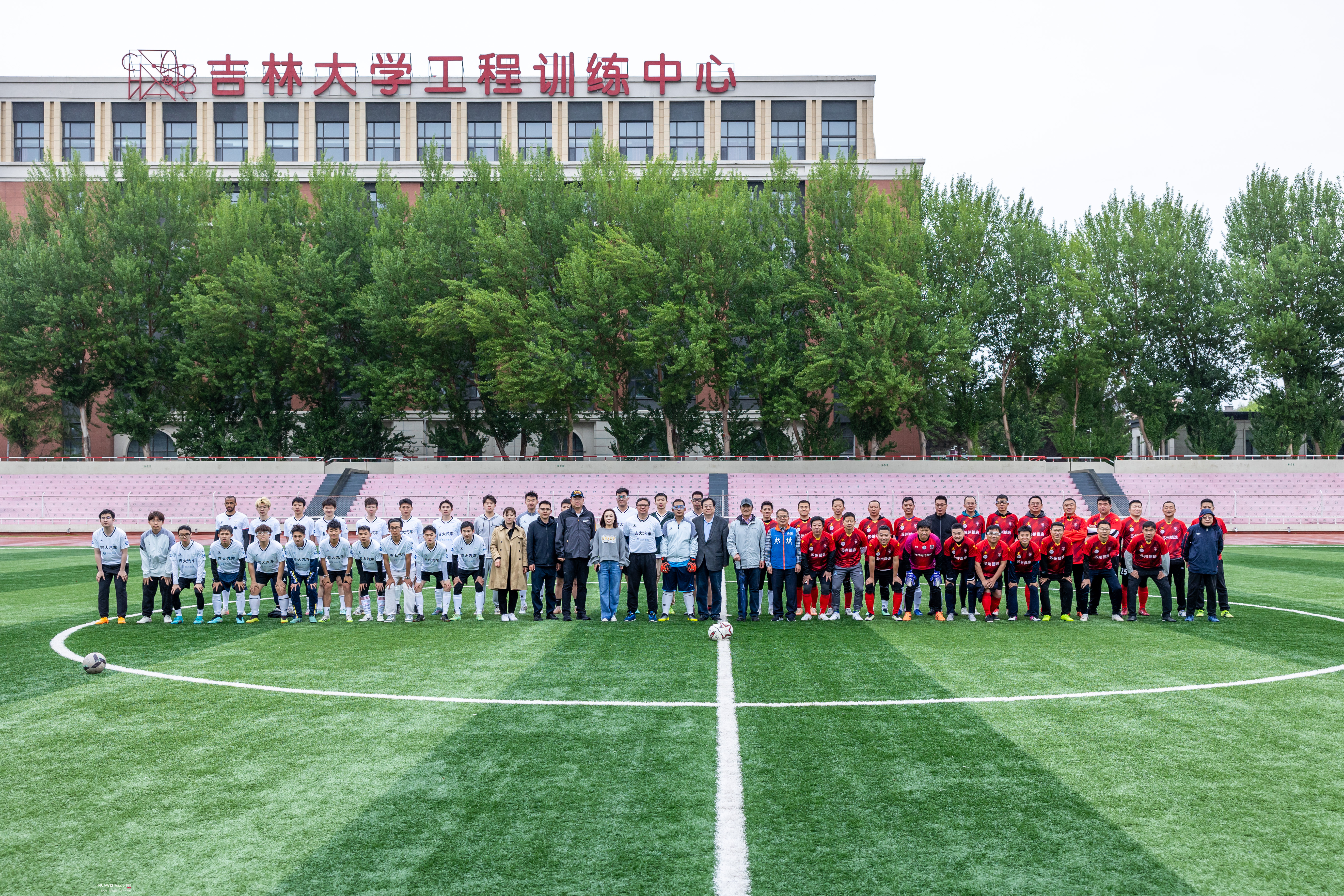 苏州德逸新能源汽车科技有限公司董事长、苏州金鸿顺汽车部件股份有限公司首席科学家林逸将凝结了汽院精神的“驭茵杯”奖杯授予双方球队队长,1996级校友、校友足球队队长杨佳音和师生足球队队长崔文骞共同接过奖杯,并合影留念。