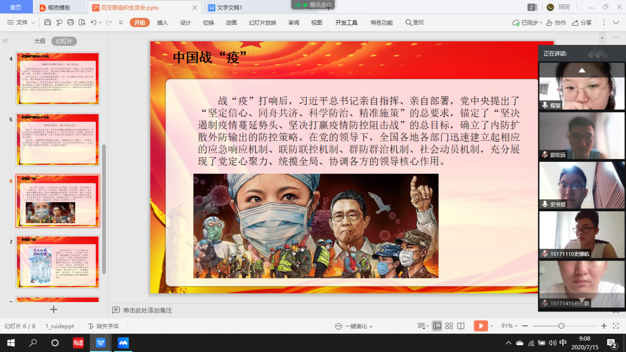最后,李季老师进行总结发言,对大家积极响应党组织的号召,投入到战“疫”工作表示肯定,强调大家要不忘共产党人的初心,时刻牢记自身使命,发挥党员先锋作用,为国家和人民做出贡献!