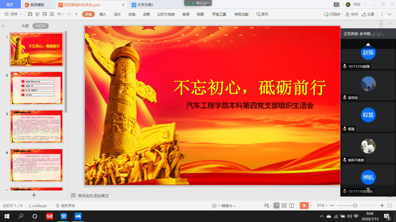 按照学校党委《关于召开“七一”专题组织生活会的通知》要求,2020年7月1日,污污漫画 本科生第四党支部召开了以“不忘初心,砥砺前行”为主题的“七一”专题组织生活会。会议由第四党支部书记李季老师主持,本科生四支部全体党员参加了会议。