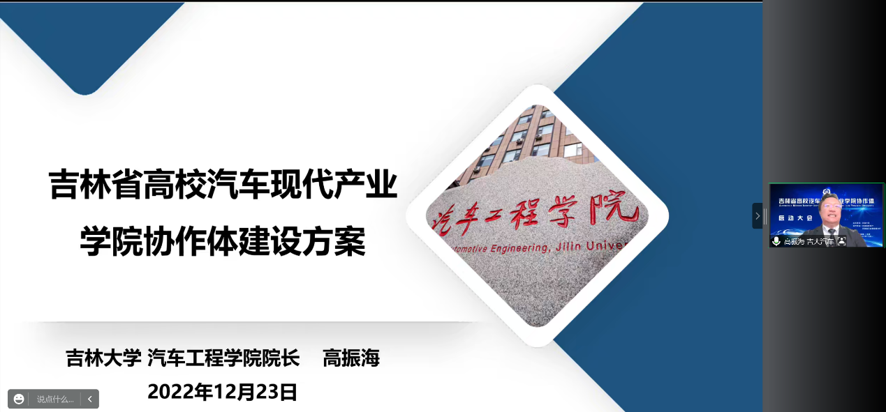 院长高振海教授向到会来宾介绍了吉林省高校汽车现代产业学院协作体的建设方案。协作体将以习近平新时代中国特色社会主义思想为指导,立足吉林省汽车产业基础,充分发挥产业优势、高校主体作用和优势特色专业支撑作用,深化产教融合,建立共享机制,构建高等教育与产业集群联动的发展模式,打造集人才培养、科学研究、技术创新、企业服务、学生就业创业等功能于一体的吉林省汽车产业人才培养联盟,形成跨高校、跨企业的汽车产业自主创新试验田和协同创新育人高地,实现互补、互利、互动、共建、共享、共赢,走出一条服务吉林省汽车产业发展新路径。